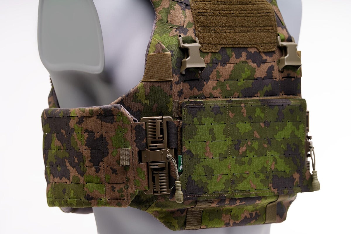 Etupaneelit kiinnittyvät Cataphractiin velcrolla ja Fastex-klipsuilla. Käyttökokemustemme mukaan paneelit saa kiinni ja irti alta minuutissa pienen sisäänajovaiheen jälkeen. Etupaneelipaikka on yhteensopiva käytännössä kaikkien SwiftClip-kiinnitteisten chestrigien ja etupaneelien kanssa!